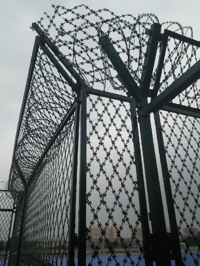 監獄刀片刺繩防護網造形獨特不易觸摸,因而能達到極好的防護隔離效果。刀片刺網由銳利尖角鍍鋅鋼板或不銹鋼薄板做刀片,高張力鋼絲做芯線組合而成的阻絕器材。直線形刀片刺網由刀片型直線刺網交叉焊接成型,具有嚇阻效果好,美觀,施工便利,經濟實用等優異特點。