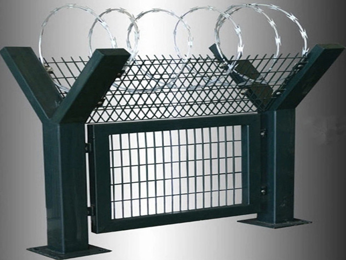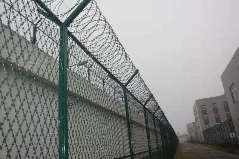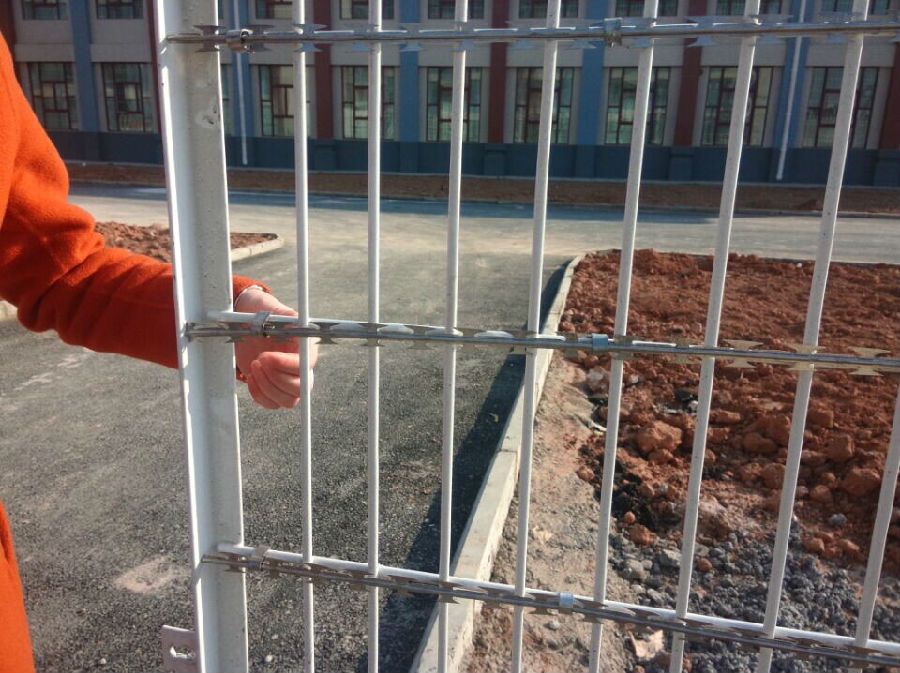 監獄外圍鋼網墻 內墻鋼網墻 圍墻鋼網墻一般頂端都設有V型支架與立柱焊接。材料通常選擇和立柱同等材料或者稍小規格材料搭配使用。V型支架的加裝是為了將蛇腹形刀刺網固定在鋼網墻頂部,從而有效的增加監獄鋼網墻的防攀爬性和安全性。V型支架加裝防拆卸刀刺網。刀刺網的直徑一般為500mm、600mm、800mm,材質均為*304不銹鋼,鎳含量8個以上。刺網芯線直徑為2.5mm、刀片長22mm,刀片寬度15mm,刀片厚度0.5mm。 蛇腹形刀刺網的排列密度不小于16圈/米,相鄰每圈間距不大于120mm 。監獄用的刀刺網通常卡扣之間的距離是120mm,直徑500mm的刀刺網,覆蓋一米的重量約為2.38公斤